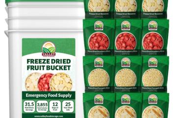 Our Freeze-Dried Fruit & Vegetable Bucket contains 6 pouches of freeze-dried fruit and 6 bags of freeze-dried vegetables, featuring our most popular produce.