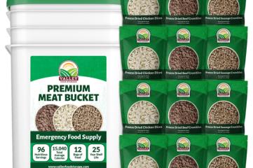Averages 96 servings per kit This bucket contains a hearty selection of freeze-dried meats, including chicken, sausage, and beef. Freeze-dried protein is always difficult to find, so grab some while you can.