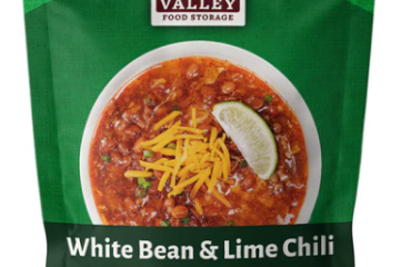 Valley Food StorageWhite Bean and Lime Chili features a thick and savory mild chili mixed with Great White Northern Beans, Pinto Beans, an assortment of vegetables and a hint of lime making it perfect for a quick and convenient lunch or dinner for